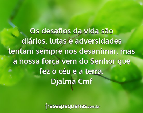 Os desafios da vida são diários, lutas e adversidades tentam sempre nos desanimar, mas a nossa força vem do Senhor que fez o céu e a terra.Djalma Cmf