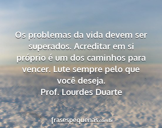 Os problemas da vida devem ser superados. Acreditar em si próprio é um dos caminhos para vencer. Lute sempre pelo que você deseja.Prof. Lourdes Duarte
