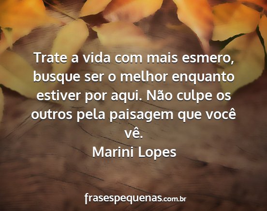 Trate a vida com mais esmero, busque ser o melhor enquanto estiver por aqui. Não culpe os outros pela paisagem que você vê.Marini Lopes