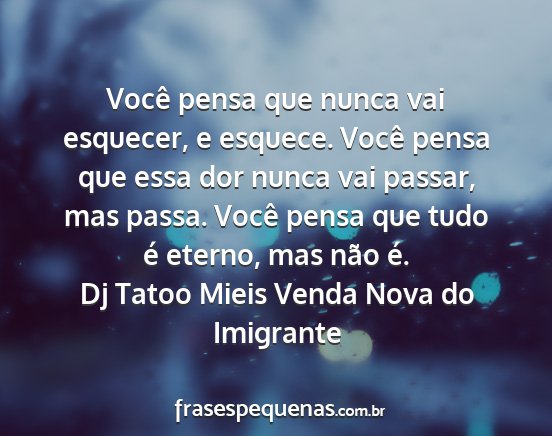 Você pensa que nunca vai esquecer, e esquece. Você pensa que essa dor nunca vai passar, mas passa. Você pensa que tudo é eterno, mas não é.Dj Tatoo Mieis Venda Nova do Imigrante