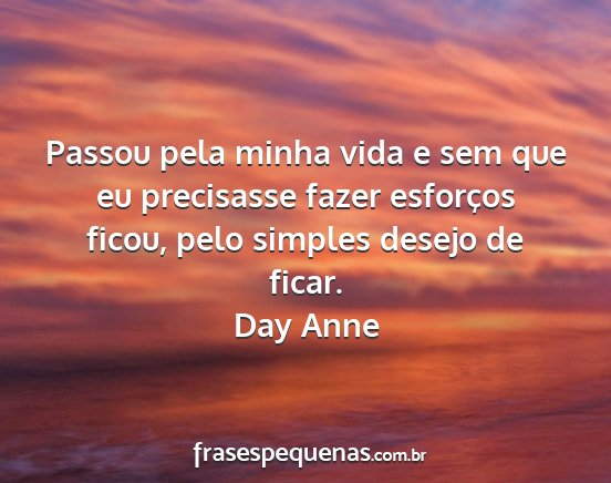 Passou pela minha vida e sem que eu precisasse fazer esforços ficou, pelo simples desejo de ficar.Day Anne