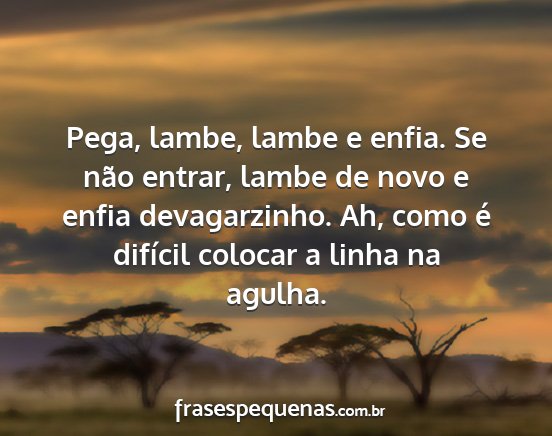 Pega, lambe, lambe e enfia. Se não entrar, lambe de novo e enfia devagarzinho. Ah, como é difícil colocar a linha na agulha.