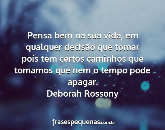 Pensa bem na sua vida, em qualquer decisão que tomar poís tem certos caminhos que tomamos que nem o tempo pode apagar.Deborah Rossony