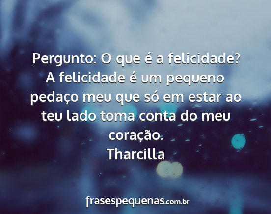 Pergunto: O que é a felicidade? A felicidade é um pequeno pedaço meu que só em estar ao teu lado toma conta do meu coração.Tharcilla