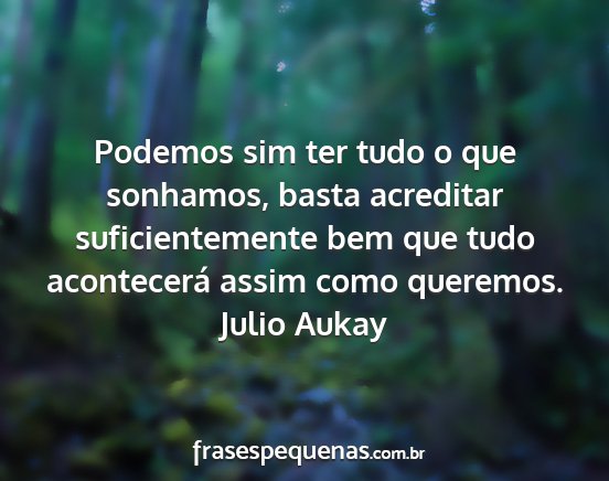 Podemos sim ter tudo o que sonhamos, basta acreditar suficientemente bem que tudo acontecerá assim como queremos.Julio Aukay