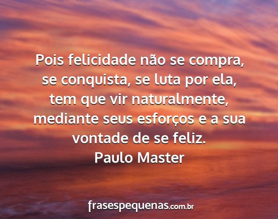 Pois felicidade não se compra, se conquista, se luta por ela, tem que vir naturalmente, mediante seus esforços e a sua vontade de se feliz.Paulo Master