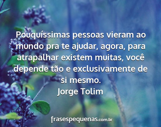 Pouquíssimas pessoas vieram ao mundo pra te ajudar, agora, para atrapalhar existem muitas, você depende tão e exclusivamente de si mesmo.Jorge Tolim