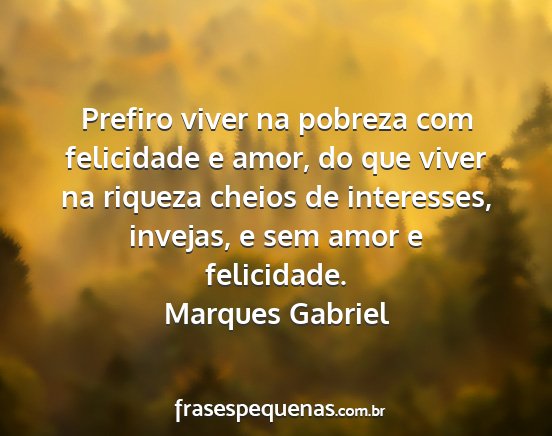 Prefiro viver na pobreza com felicidade e amor, do que viver na riqueza cheios de interesses, invejas, e sem amor e felicidade.Marques Gabriel