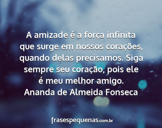 A amizade é a força infinita que surge em nossos corações, quando delas precisamos. Siga sempre seu coração, pois ele é meu melhor amigo.Ananda de Almeida Fonseca