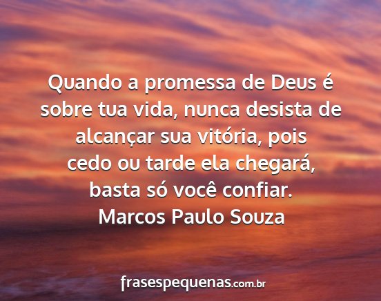 Quando a promessa de Deus é sobre tua vida, nunca desista de alcançar sua vitória, pois cedo ou tarde ela chegará, basta só você confiar.Marcos Paulo Souza