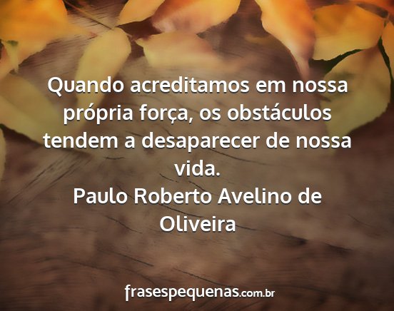 Quando acreditamos em nossa própria força, os obstáculos tendem a desaparecer de nossa vida.Paulo Roberto Avelino de Oliveira