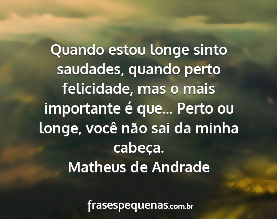Quando estou longe sinto saudades, quando perto felicidade, mas o mais importante é que... Perto ou longe, você não sai da minha cabeça.Matheus de Andrade