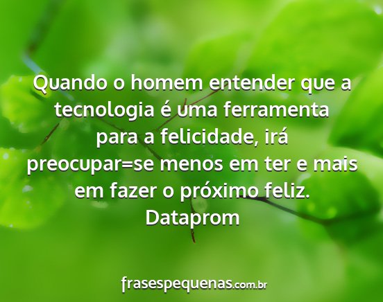Quando o homem entender que a tecnologia é uma ferramenta para a felicidade, irá preocupar=se menos em ter e mais em fazer o próximo feliz.Dataprom