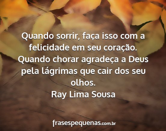 Quando sorrir, faça isso com a felicidade em seu coração. Quando chorar agradeça a Deus pela lágrimas que cair dos seu olhos.Ray Lima Sousa
