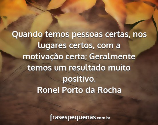 Quando temos pessoas certas, nos lugares certos, com a motivação certa; Geralmente temos um resultado muito positivo.Ronei Porto da Rocha
