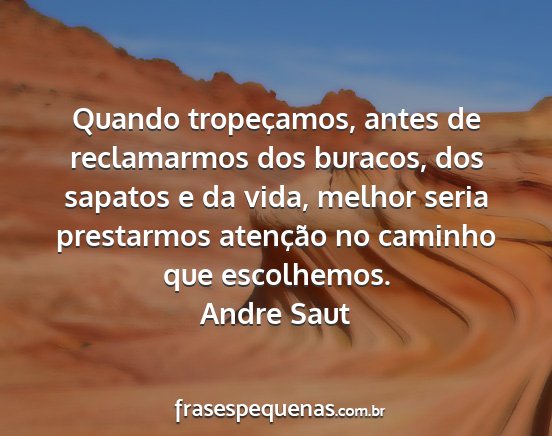 Quando tropeçamos, antes de reclamarmos dos buracos, dos sapatos e da vida, melhor seria prestarmos atenção no caminho que escolhemos.Andre Saut
