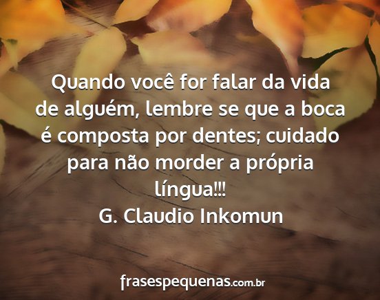 Quando você for falar da vida de alguém, lembre se que a boca é composta por dentes; cuidado para não morder a própria língua!!!G. Claudio Inkomun