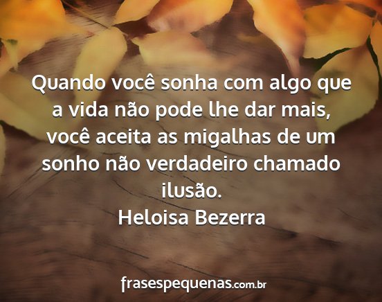 Quando você sonha com algo que a vida não pode lhe dar mais, você aceita as migalhas de um sonho não verdadeiro chamado ilusão.Heloisa Bezerra