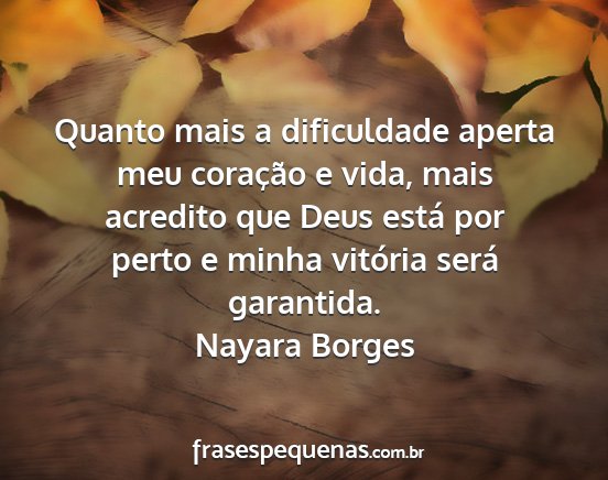 Quanto mais a dificuldade aperta meu coração e vida, mais acredito que Deus está por perto e minha vitória será garantida.Nayara Borges