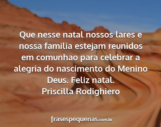 Que nesse natal nossos lares e nossa familia estejam reunidos em comunhao para celebrar a alegria do nascimento do Menino Deus. Feliz natal.Priscilla Rodighiero