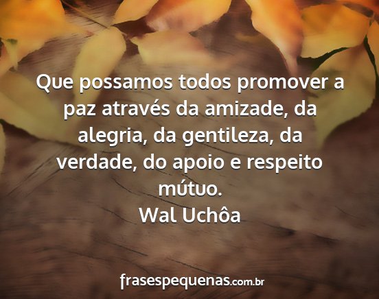 Que possamos todos promover a paz através da amizade, da alegria, da gentileza, da verdade, do apoio e respeito mútuo.Wal Uchôa