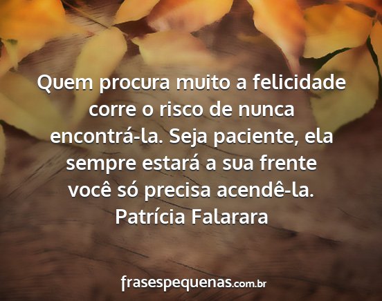 Quem procura muito a felicidade corre o risco de nunca encontrá-la. Seja paciente, ela sempre estará a sua frente você só precisa acendê-la.Patrícia Falarara
