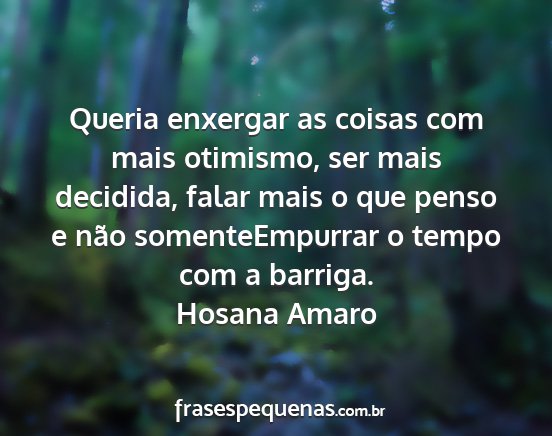 Queria enxergar as coisas com mais otimismo, ser mais decidida, falar mais o que penso e não somenteEmpurrar o tempo com a barriga.Hosana Amaro