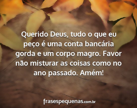 Querido Deus, tudo o que eu peço é uma conta bancária gorda e um corpo magro. Favor não misturar as coisas como no ano passado. Amém!