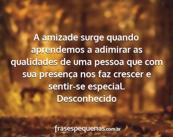 A amizade surge quando aprendemos a adimirar as qualidades de uma pessoa que com sua presença nos faz crescer e sentir-se especial.Desconhecido