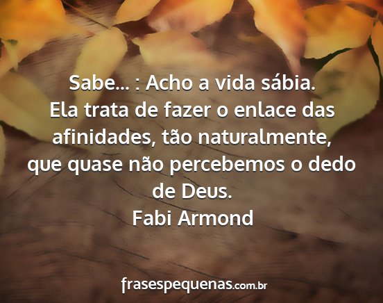 Sabe... : Acho a vida sábia. Ela trata de fazer o enlace das afinidades, tão naturalmente, que quase não percebemos o dedo de Deus.Fabi Armond