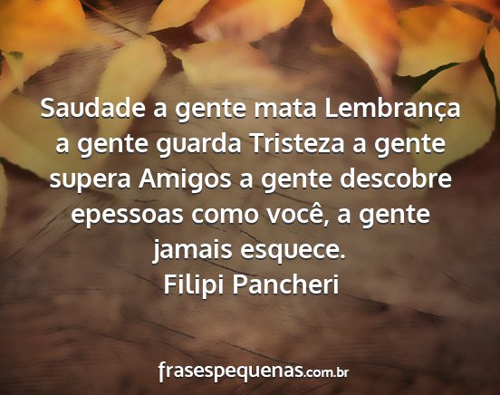 Saudade a gente mata Lembrança a gente guarda Tristeza a gente supera Amigos a gente descobre epessoas como você, a gente jamais esquece.Filipi Pancheri