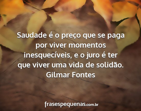 Saudade é o preço que se paga por viver momentos inesquecíveis, e o juro é ter que viver uma vida de solidão.Gilmar Fontes