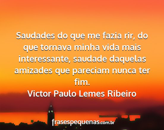 Saudades do que me fazia rir, do que tornava minha vida mais interessante, saudade daquelas amizades que pareciam nunca ter fim.Victor Paulo Lemes Ribeiro