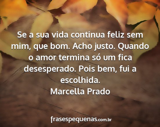 Se a sua vida continua feliz sem mim, que bom. Acho justo. Quando o amor termina só um fica desesperado. Pois bem, fui a escolhida.Marcella Prado