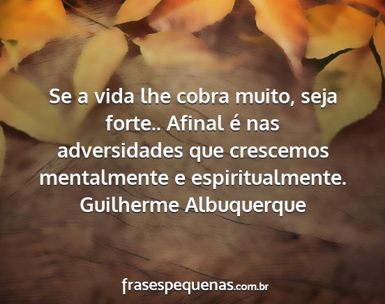 Se a vida lhe cobra muito, seja forte.. Afinal é nas adversidades que crescemos mentalmente e espiritualmente.Guilherme Albuquerque