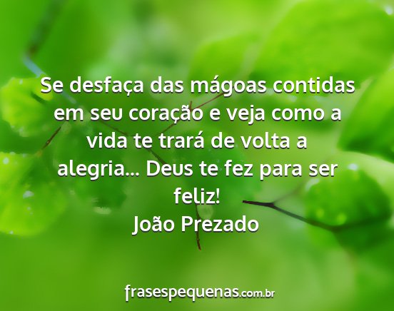 Se desfaça das mágoas contidas em seu coração e veja como a vida te trará de volta a alegria... Deus te fez para ser feliz!João Prezado
