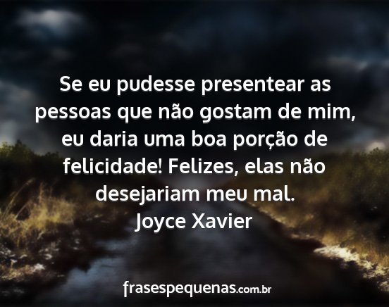 Se eu pudesse presentear as pessoas que não gostam de mim, eu daria uma boa porção de felicidade! Felizes, elas não desejariam meu mal.Joyce Xavier
