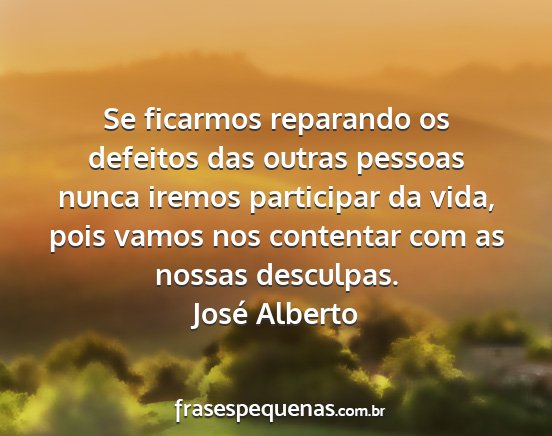 Se ficarmos reparando os defeitos das outras pessoas nunca iremos participar da vida, pois vamos nos contentar com as nossas desculpas.José Alberto