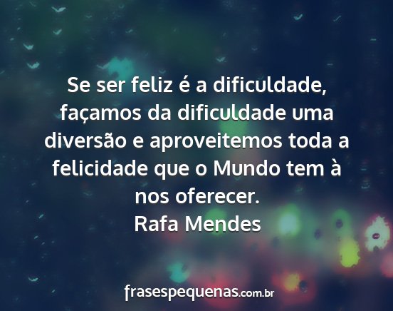 Se ser feliz é a dificuldade, façamos da dificuldade uma diversão e aproveitemos toda a felicidade que o Mundo tem à nos oferecer.Rafa Mendes