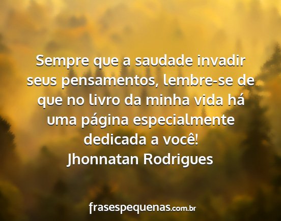 Sempre que a saudade invadir seus pensamentos, lembre-se de que no livro da minha vida há uma página especialmente dedicada a você!Jhonnatan Rodrigues