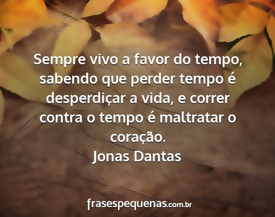 Sempre vivo a favor do tempo, sabendo que perder tempo é desperdiçar a vida, e correr contra o tempo é maltratar o coração.Jonas Dantas