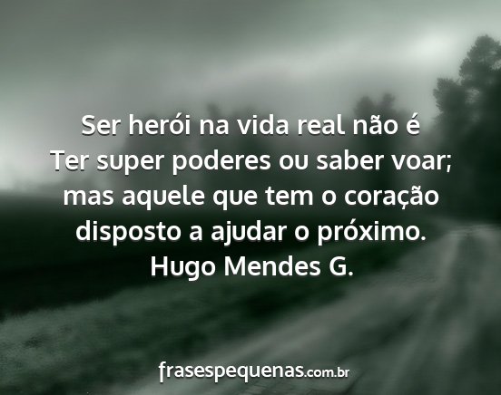 Ser herói na vida real não é Ter super poderes ou saber voar; mas aquele que tem o coração disposto a ajudar o próximo.Hugo Mendes G.