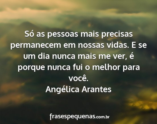 Só as pessoas mais precisas permanecem em nossas vidas. E se um dia nunca mais me ver, é porque nunca fui o melhor para você.Angélica Arantes