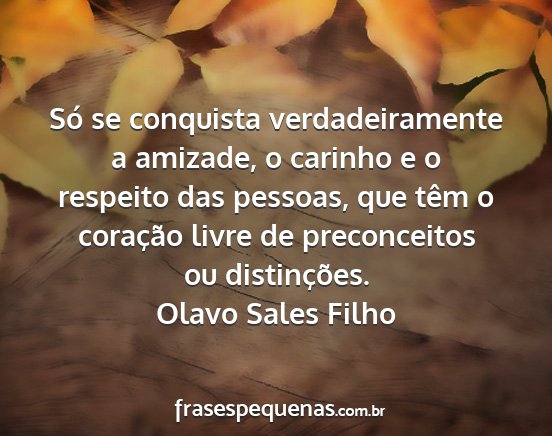 Só se conquista verdadeiramente a amizade, o carinho e o respeito das pessoas, que têm o coração livre de preconceitos ou distinções.Olavo Sales Filho