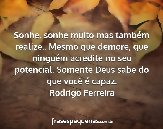 Sonhe, sonhe muito mas também realize.. Mesmo que demore, que ninguém acredite no seu potencial. Somente Deus sabe do que você é capaz.Rodrigo Ferreira