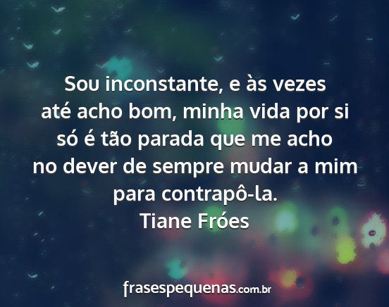 Sou inconstante, e às vezes até acho bom, minha vida por si só é tão parada que me acho no dever de sempre mudar a mim para contrapô-la.Tiane Fróes