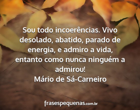 Sou todo incoerências. Vivo desolado, abatido, parado de energia, e admiro a vida, entanto como nunca ninguém a admirou!Mário de Sá-Carneiro