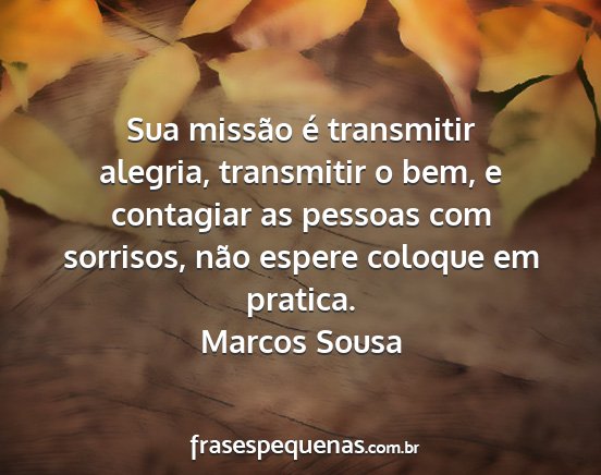 Sua missão é transmitir alegria, transmitir o bem, e contagiar as pessoas com sorrisos, não espere coloque em pratica.Marcos Sousa