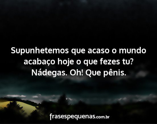 Supunhetemos que acaso o mundo acabaço hoje o que fezes tu? Nádegas. Oh! Que pênis.