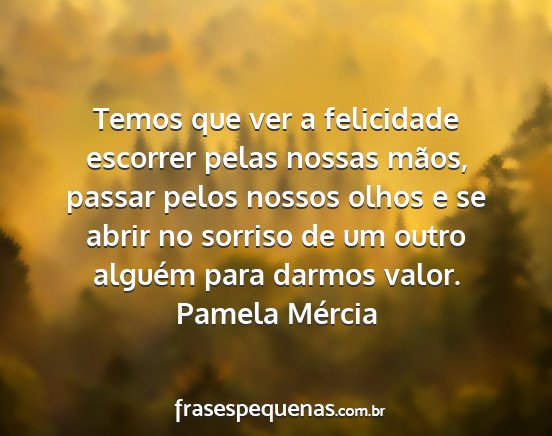 Temos que ver a felicidade escorrer pelas nossas mãos, passar pelos nossos olhos e se abrir no sorriso de um outro alguém para darmos valor.Pamela Mércia